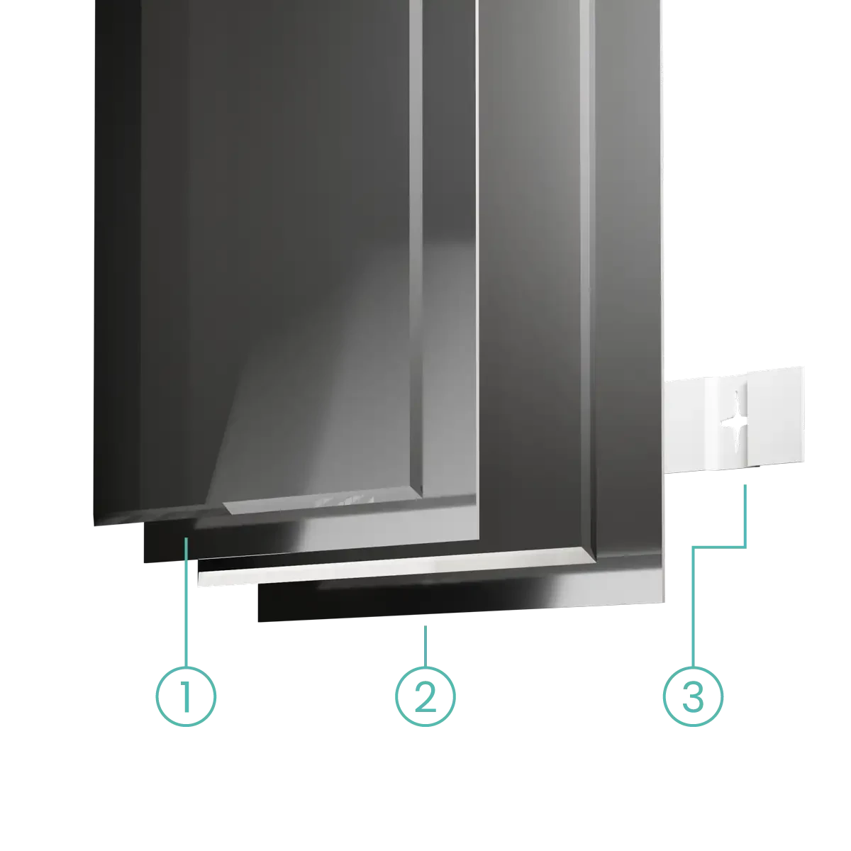 A touch of art deco elegance in it's dual-layer of bevelled glass, yet with modern weightlessness in this frameless mounting style.