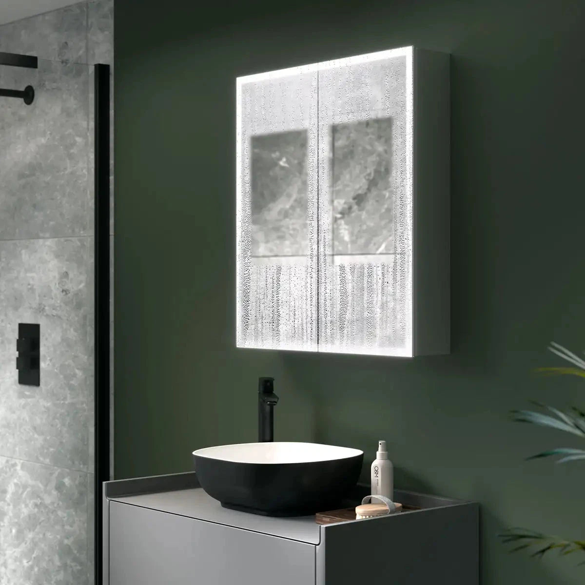 The doors are trimmed with frosted glass to diffuse the lighting and create a soft glowing border. When open, the light reflects back from the internal door mirrors to illuminate inside.