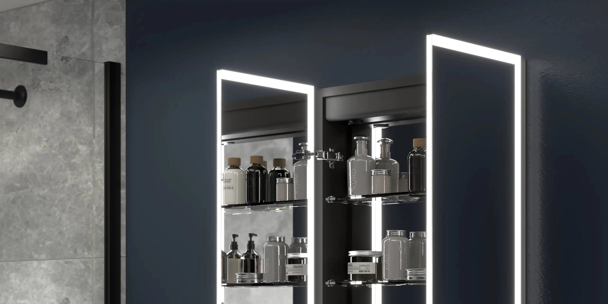 The doors are mirrored inside and out. Use the touch sensor to adjust the LED frame from cool to warm white.